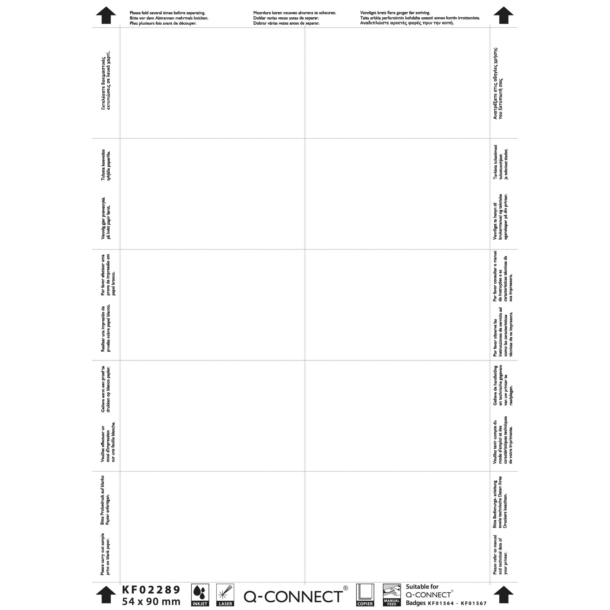 COMMERCIAL INFORMATION:Q-Connect name badge inserts for use with the Q-Connect range of badges. Finely perforated edges allow a clean tear. Can be used on laser or inkjet printers. 54 x 90mm - 10 per sheet.