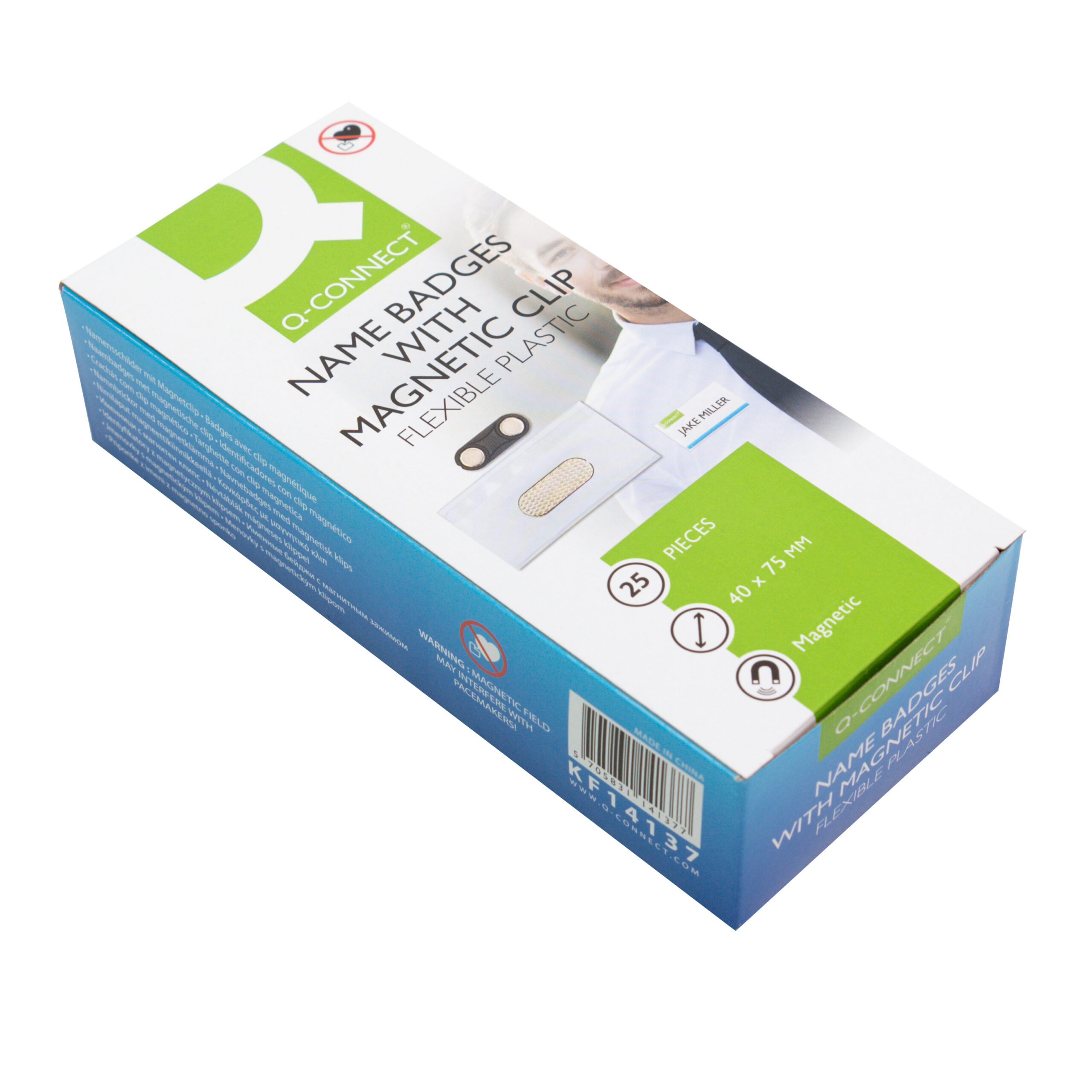 COMMERCIAL INFORMATION:Q-Connect name badges with magnetic clip. Soft flexibel PVC badges to suit all accasions. Features transparent covers to protect but display name cards clearly and has a magnetic clip at the back to attach to your clothing without damaging the fabric. Size: 40x75mm.